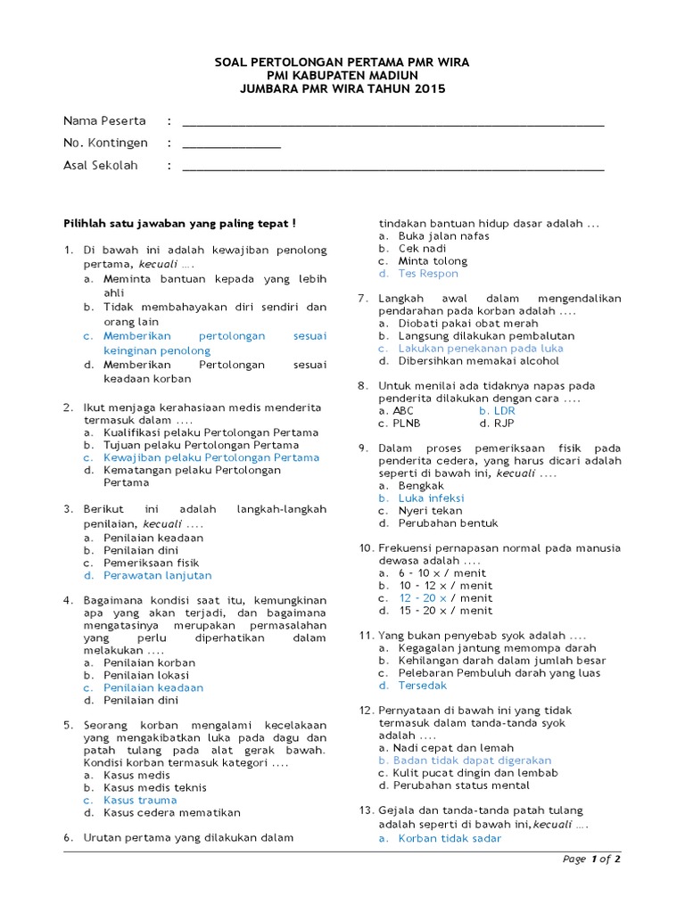 Doc Soal Pertolongan Pertama Pmr Wira Pmi Kabupaten Madiun Jumbara Pmr Wira Tahun 2015 Simsim Aja Academia Edu